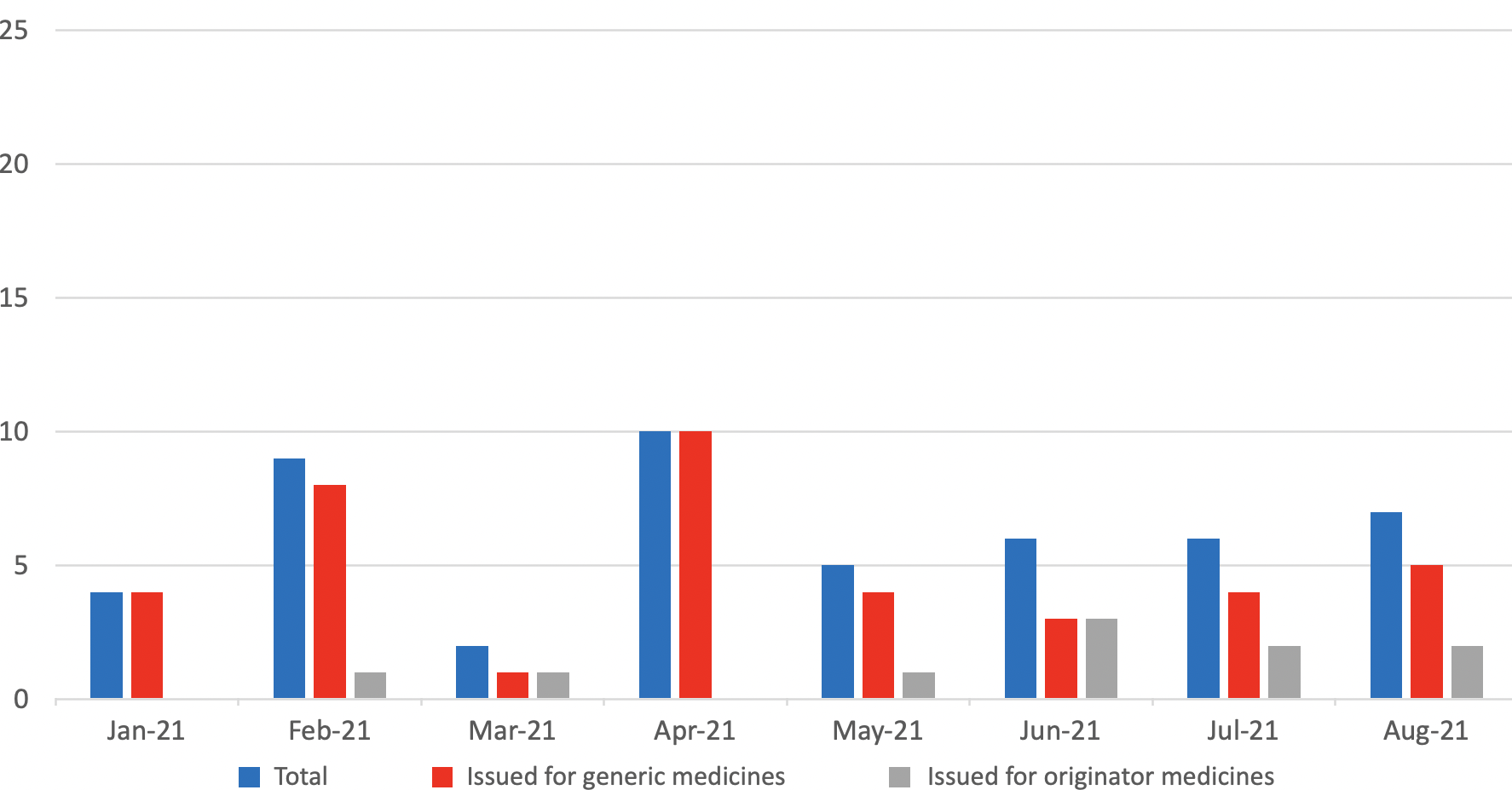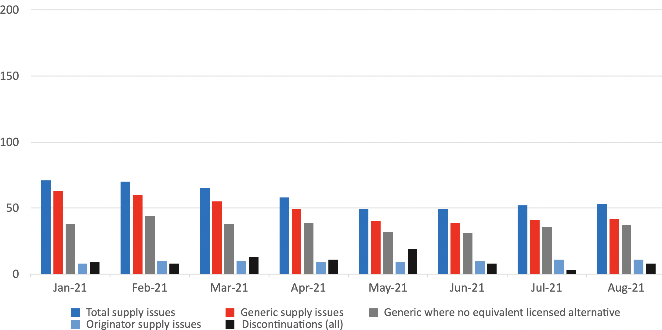 Looking at August 2021, Medicines UK provides a monthly snapshot of the numbers of supply issues affecting generic[1] medicines in England, based on UK Government and NHS data.