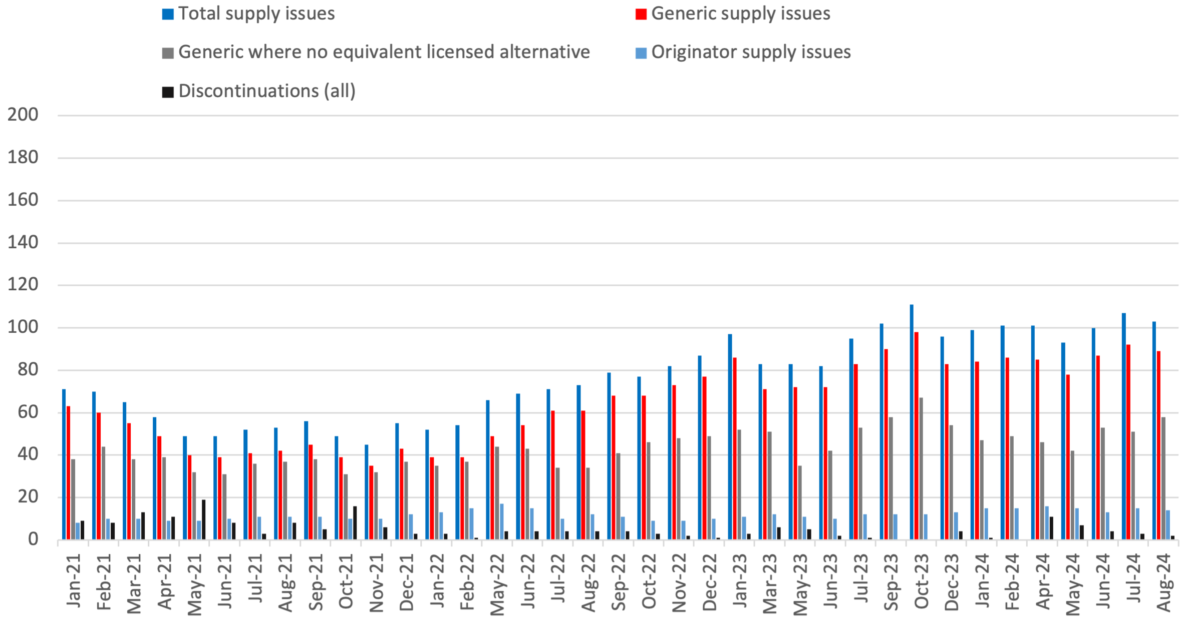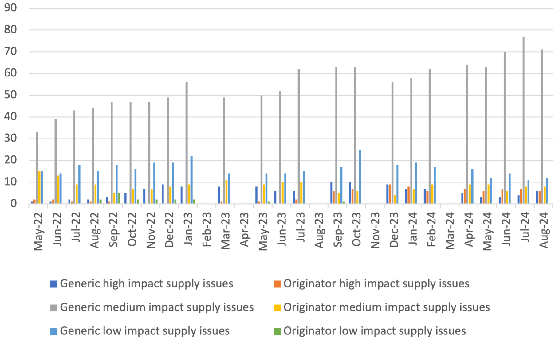 Looking at August 2024[1], Medicines UK provides a monthly snapshot of the numbers of supply issues affecting generic[2] medicines in England, based on UK Government and NHS data. Since our analysis in February 2022, the Department of Health and Social Care has moved its supply issues update to being hosted on the Specialist Pharmacy Service (SPS) website. As a result, we have changed some of the ways we measure different kinds of supply issues to replicate the categorisations in the SPS medicines supply tool.