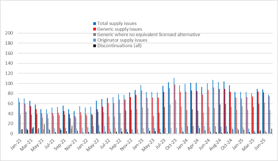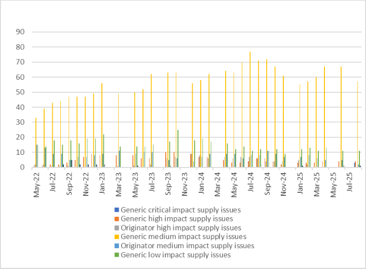 Looking at August 2025[1], Medicines UK provides a monthly snapshot of the numbers of supply issues affecting generic[2] medicines in England, based on UK Government and NHS data.