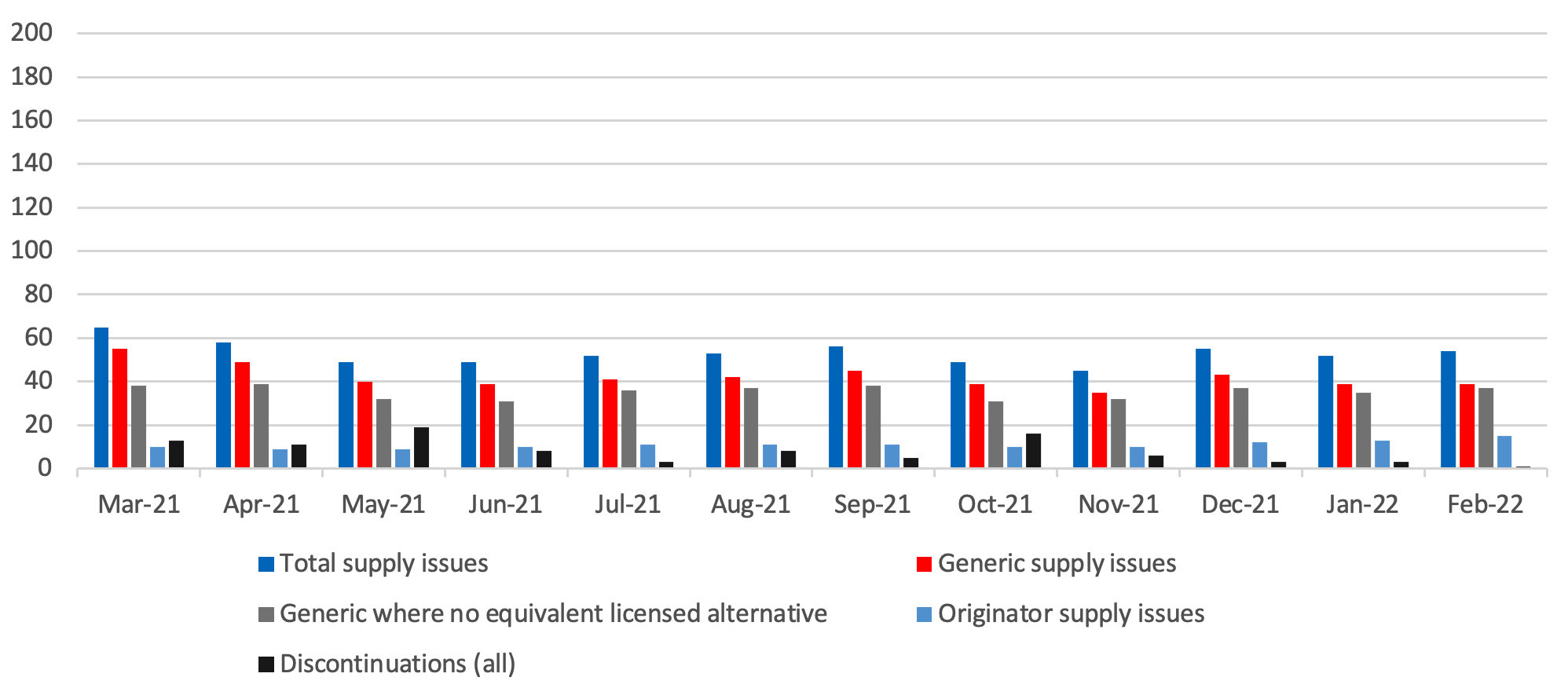 Looking at February 2022, Medicines UK provides a monthly snapshot of the numbers of supply issues affecting generic[1] medicines in England, based on UK Government and NHS data.