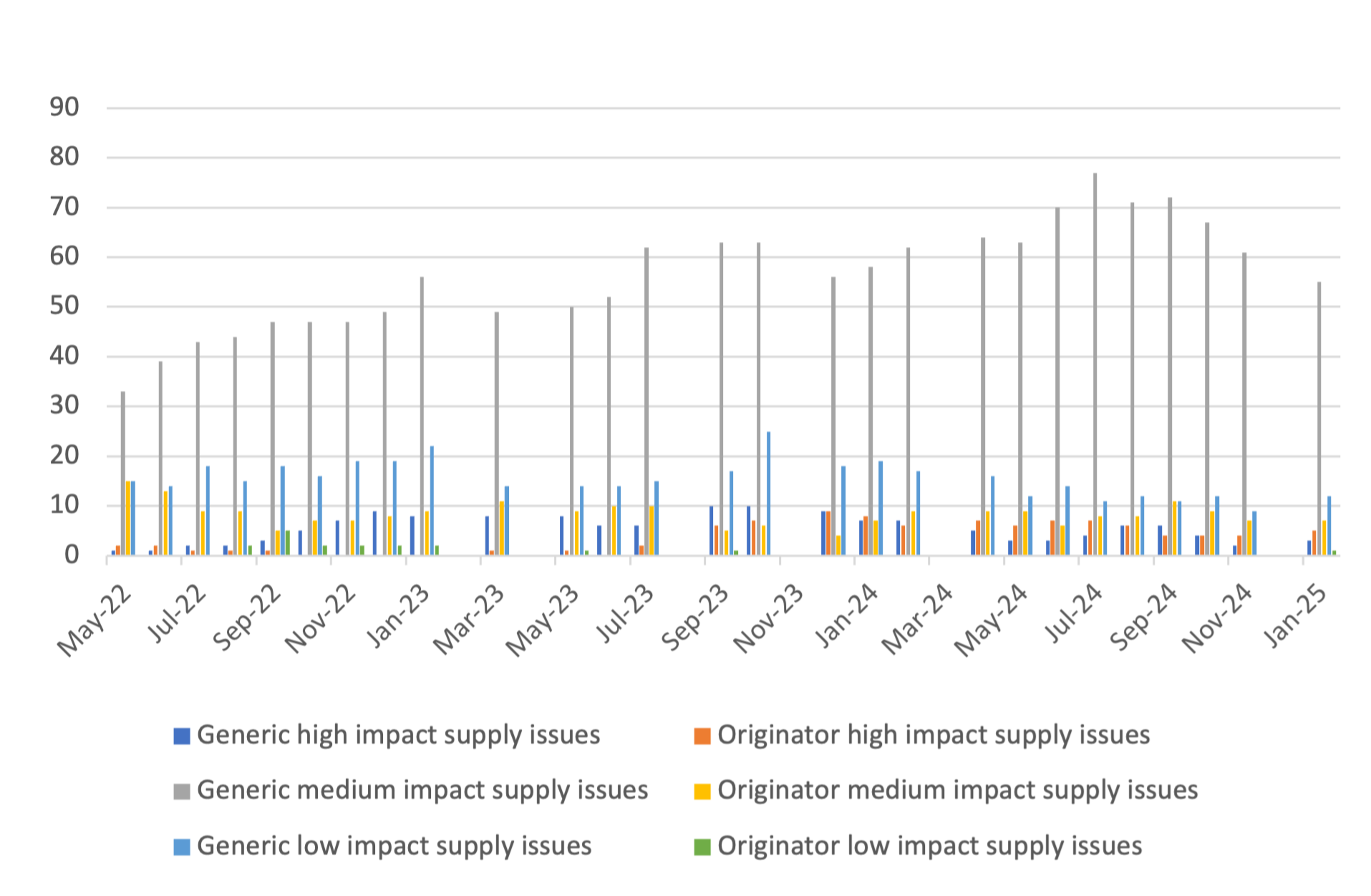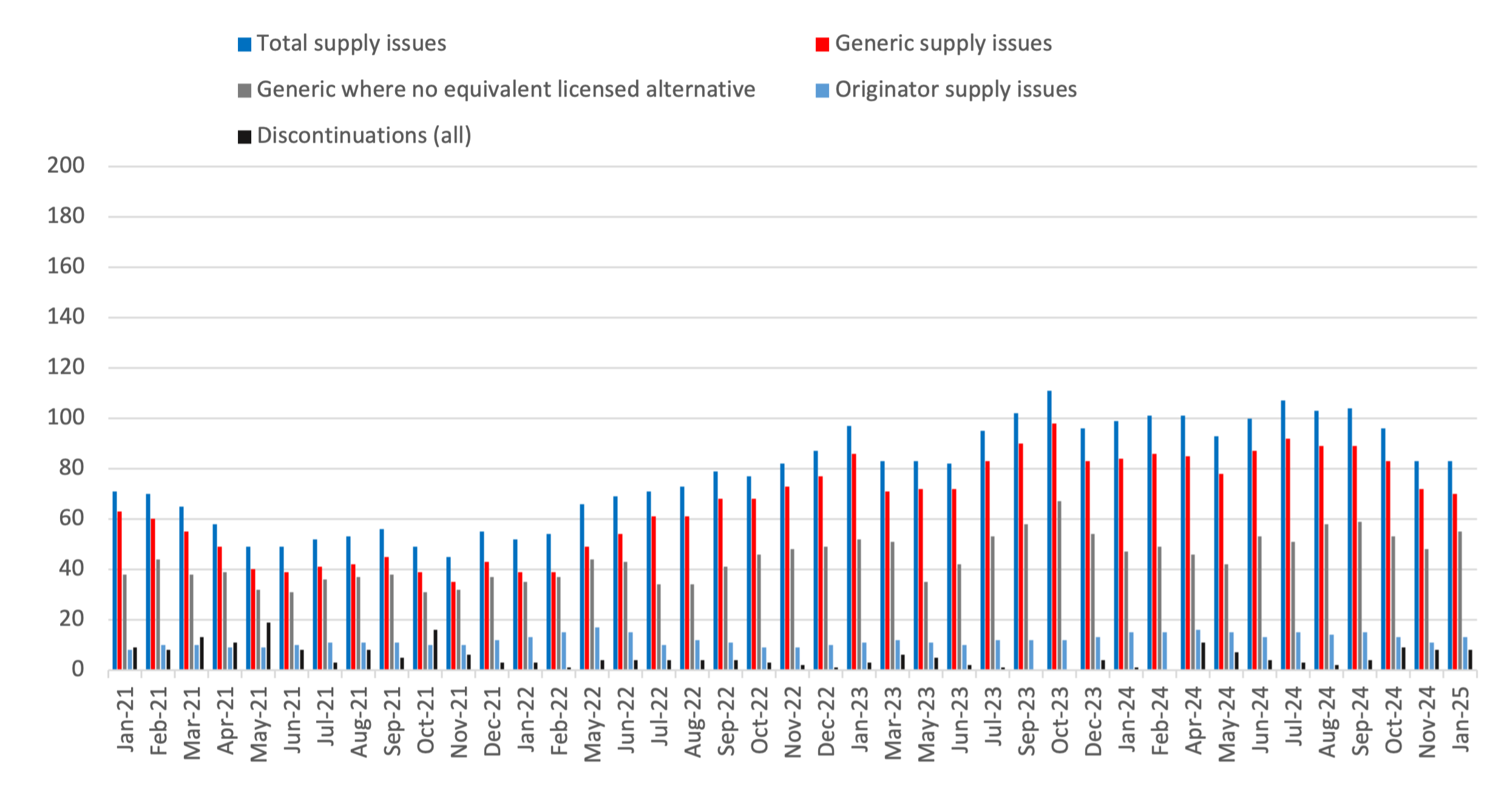It is important to note that the Department of Health and Social Care and NHS England work with suppliers to resolve and mitigate more supply issues than we count through this analysis. The supply issues we count cover below are the medicine presentations that DHSC and NHSE cannot adequately resolve nor mitigate, or feel it is important to make aware to pharmacists and NHS commissioners.