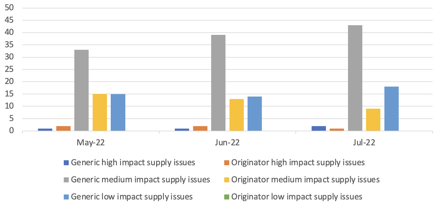 Looking at July 2022[1], Medicines UK provides a monthly snapshot of the numbers of supply issues affecting generic[2] medicines in England, based on UK Government and NHS data. Since our analysis in February 2022, the Department of Health and Social Care has moved its supply issues update to being hosted on the Specialist Pharmacy Service (SPS) website. As a result, we have changed some of the ways we measure different kinds of supply issues to replicate the categorisations in the SPS medicines supply tool.