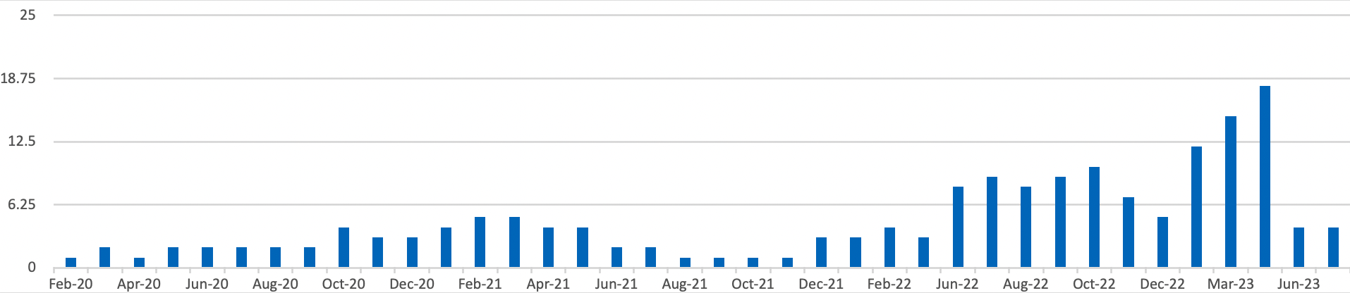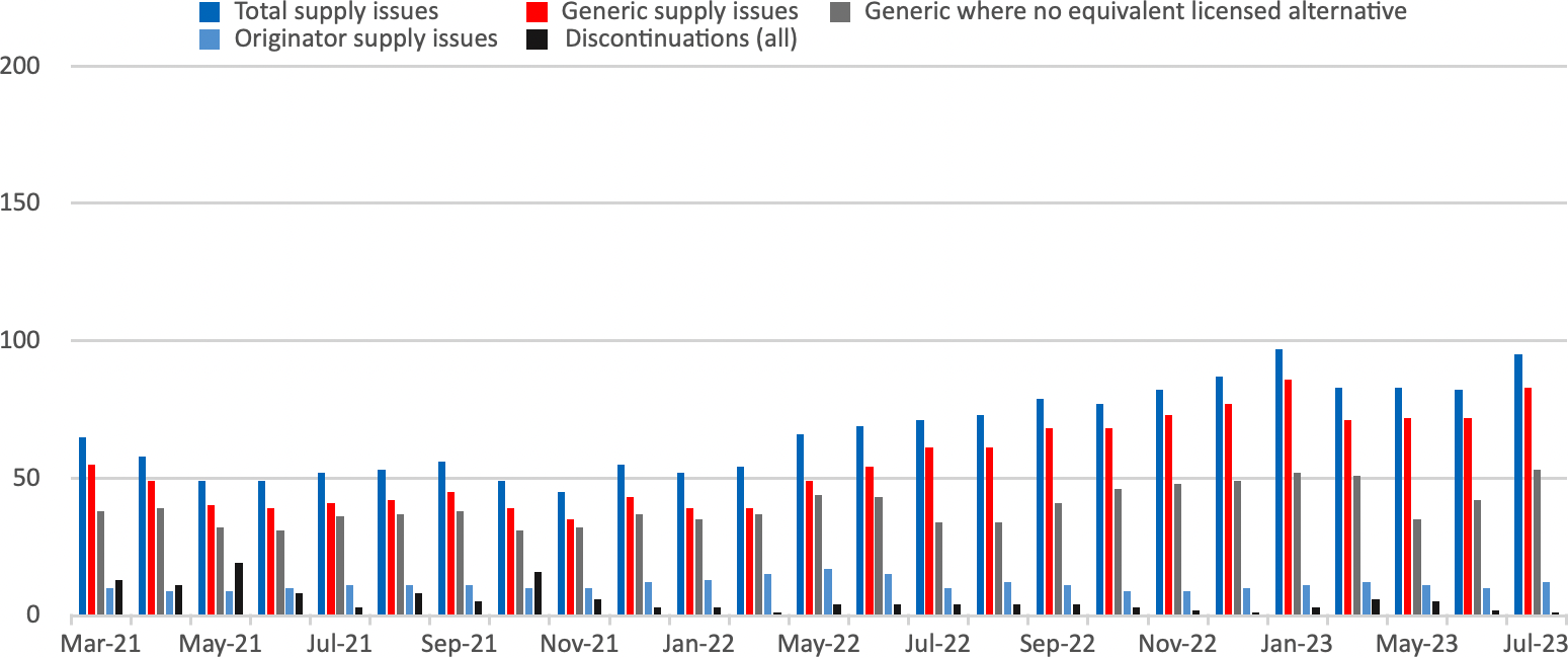 Looking at July 2023[1], Medicines UK provides a monthly snapshot of the numbers of supply issues affecting generic[2] medicines in England, based on UK Government and NHS data. Since our analysis in February 2022, the Department of Health and Social Care has moved its supply issues update to being hosted on the Specialist Pharmacy Service (SPS) website. As a result, we have changed some of the ways we measure different kinds of supply issues to replicate the categorisations in the SPS medicines supply tool.