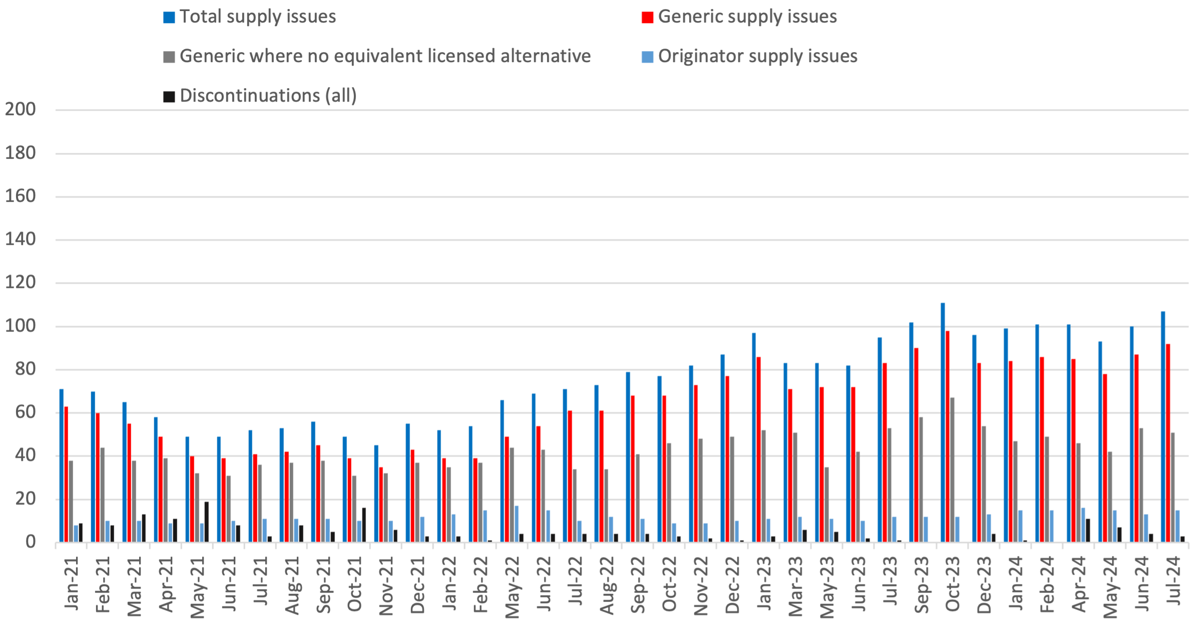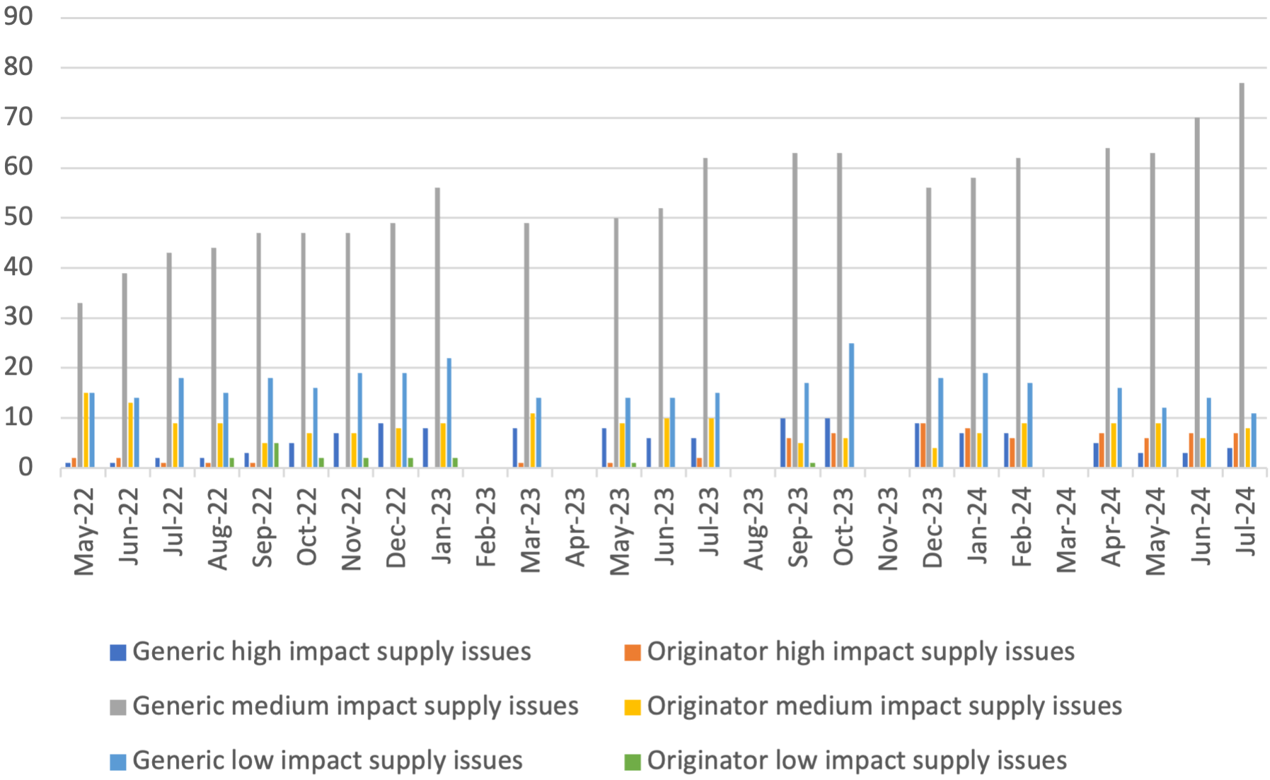 Looking at July 2024[1], Medicines UK provides a monthly snapshot of the numbers of supply issues affecting generic[2] medicines in England, based on UK Government and NHS data. Since our analysis in February 2022, the Department of Health and Social Care has moved its supply issues update to being hosted on the Specialist Pharmacy Service (SPS) website. As a result, we have changed some of the ways we measure different kinds of supply issues to replicate the categorisations in the SPS medicines supply tool.
