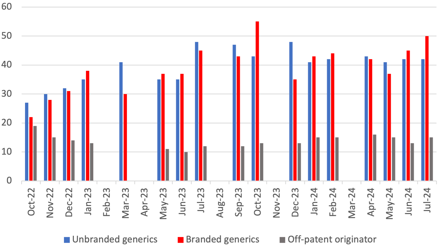Percentage of branded generics[8]as a proportion of the generic medicines experiencing a supply issue in July 2024