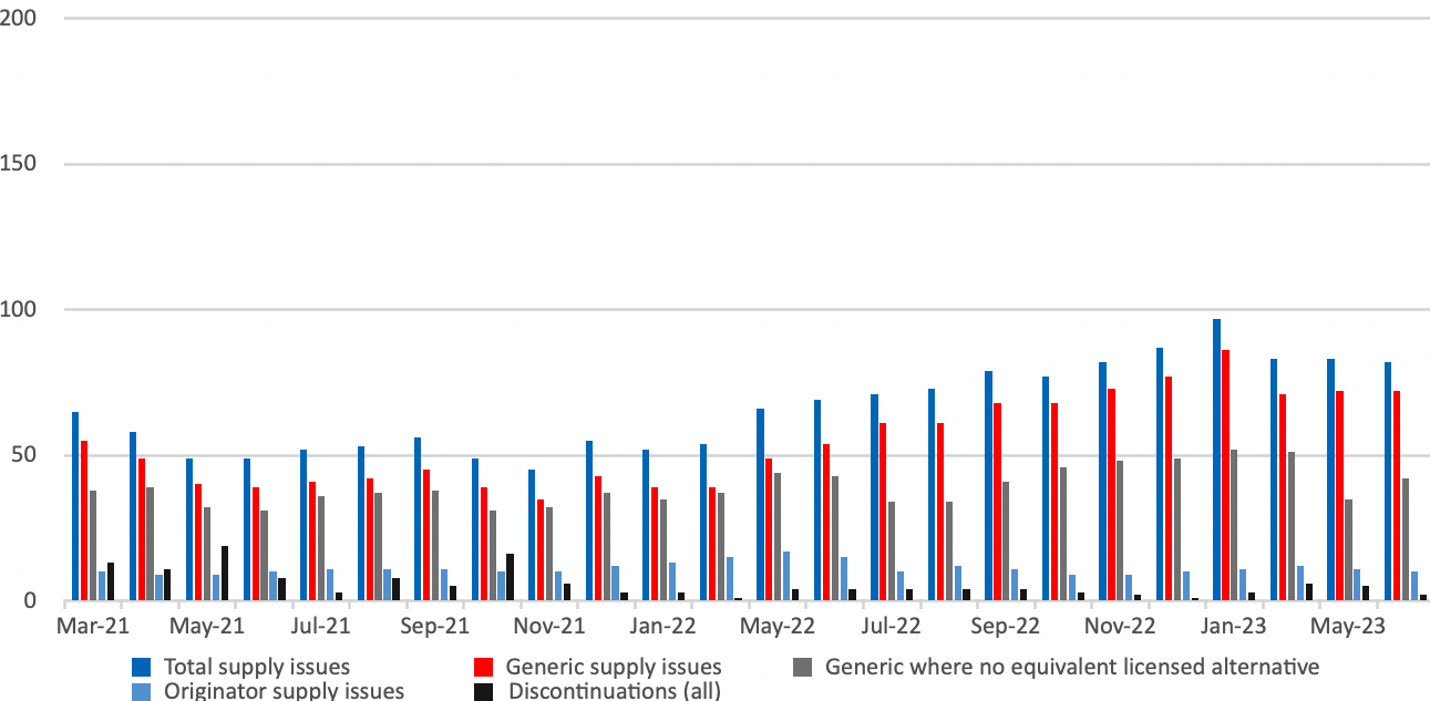 Looking at June 2023[1], Medicines UK provides a monthly snapshot of the numbers of supply issues affecting generic[2] medicines in England, based on UK Government and NHS data. Since our analysis in February 2022, the Department of Health and Social Care has moved its supply issues update to being hosted on the Specialist Pharmacy Service (SPS) website. As a result, we have changed some of the ways we measure different kinds of supply issues to replicate the categorisations in the SPS medicines supply tool.