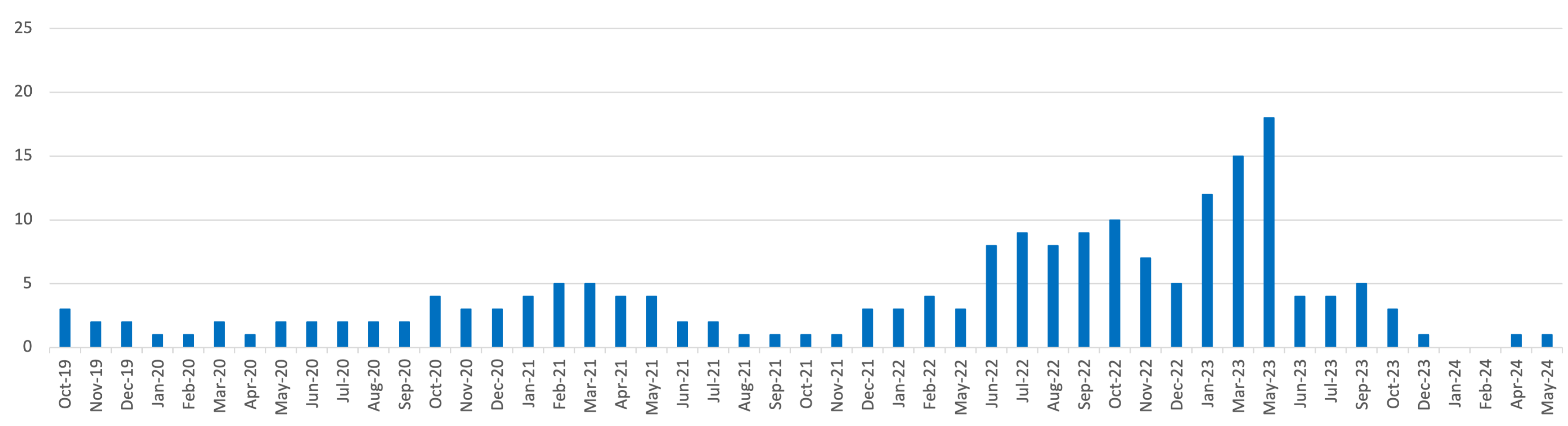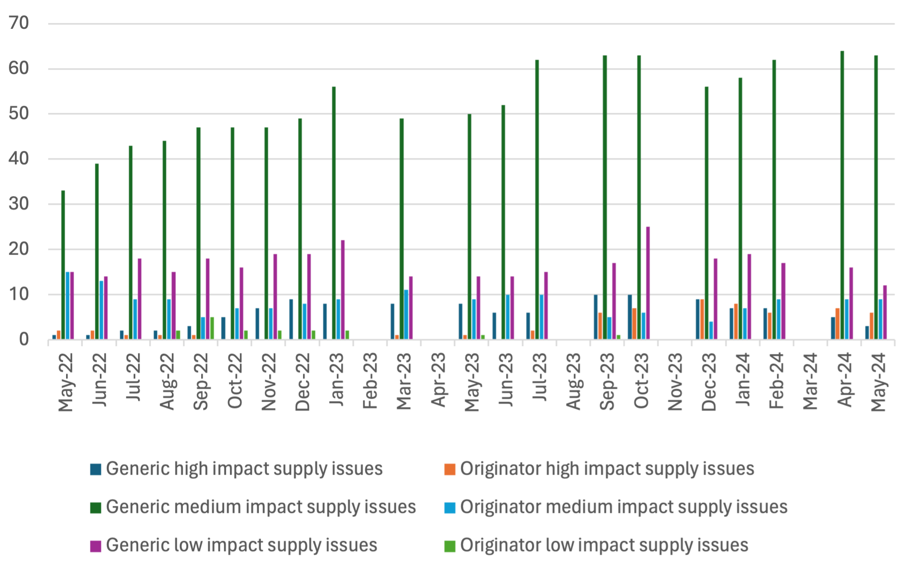 Looking at June 2024[1], Medicines UK provides a monthly snapshot of the numbers of supply issues affecting generic[2] medicines in England, based on UK Government and NHS data. Since our analysis in February 2022, the Department of Health and Social Care has moved its supply issues update to being hosted on the Specialist Pharmacy Service (SPS) website. As a result, we have changed some of the ways we measure different kinds of supply issues to replicate the categorisations in the SPS medicines supply tool.