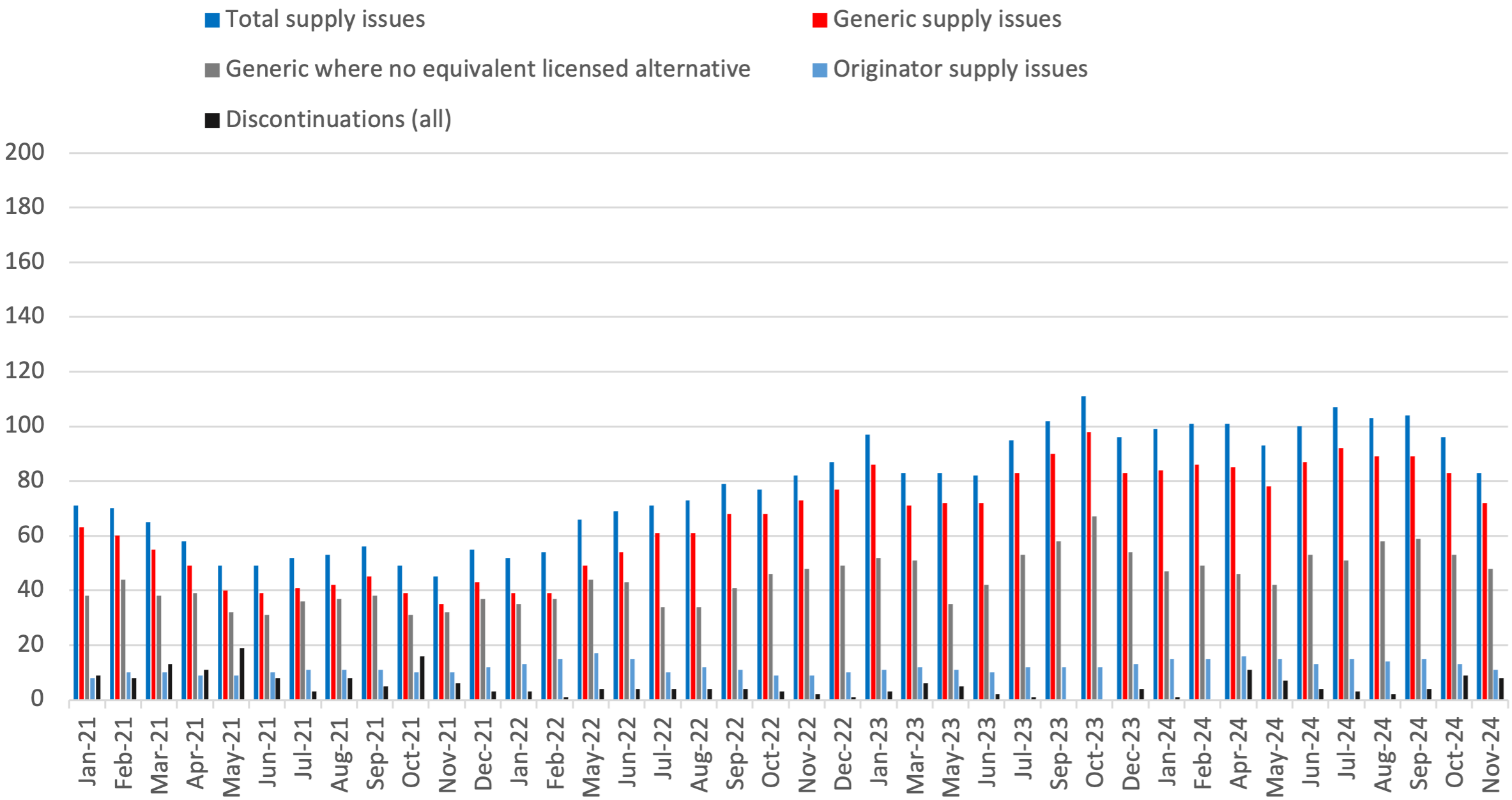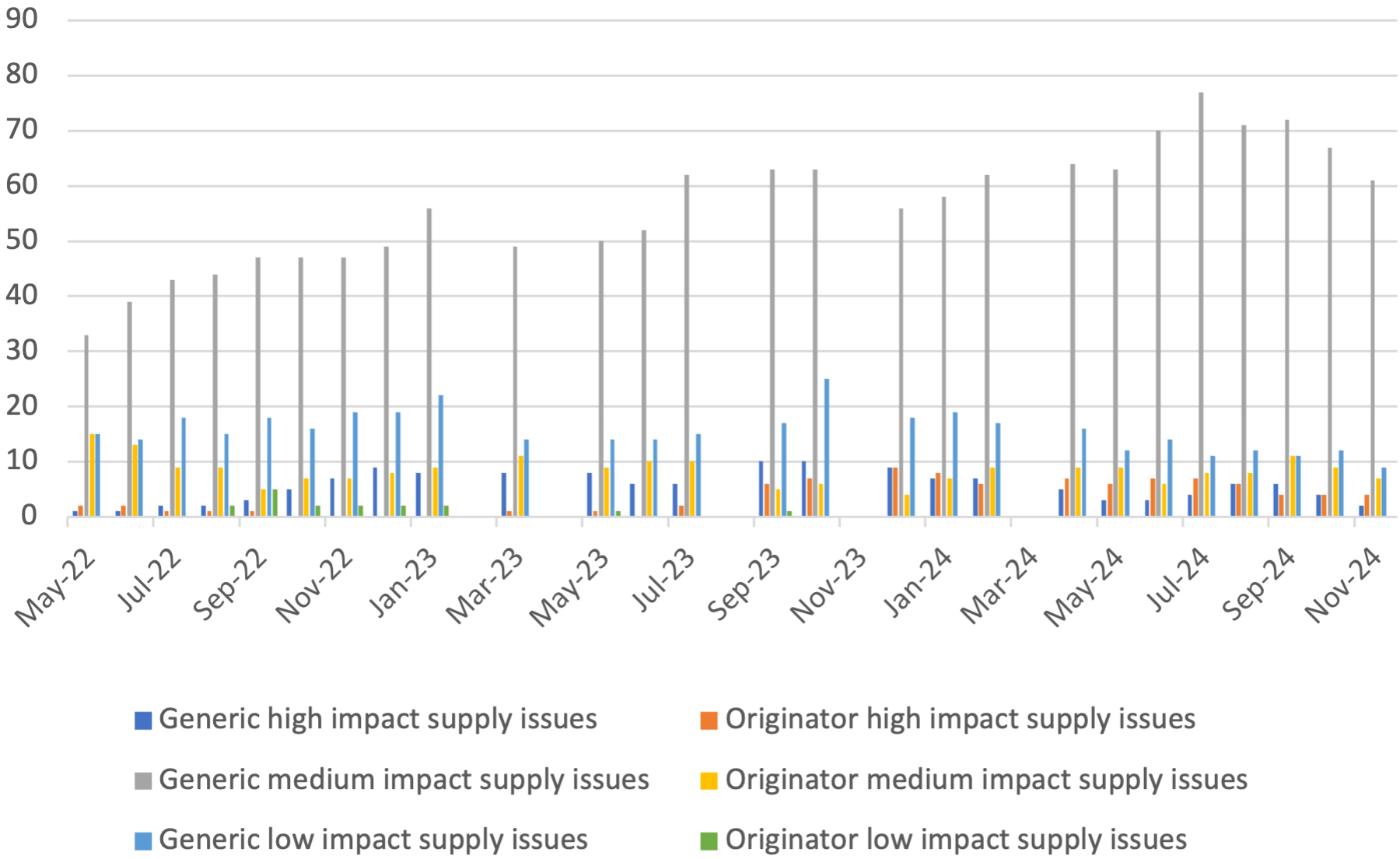 It is important to note that the Department of Health and Social Care and NHS England work with suppliers to resolve and mitigate more supply issues than we count through this analysis. The supply issues we count cover below are the medicine presentations that DHSC and NHSE cannot adequately resolve nor mitigate, or feel it is important to make aware to pharmacists and NHS commissioners.