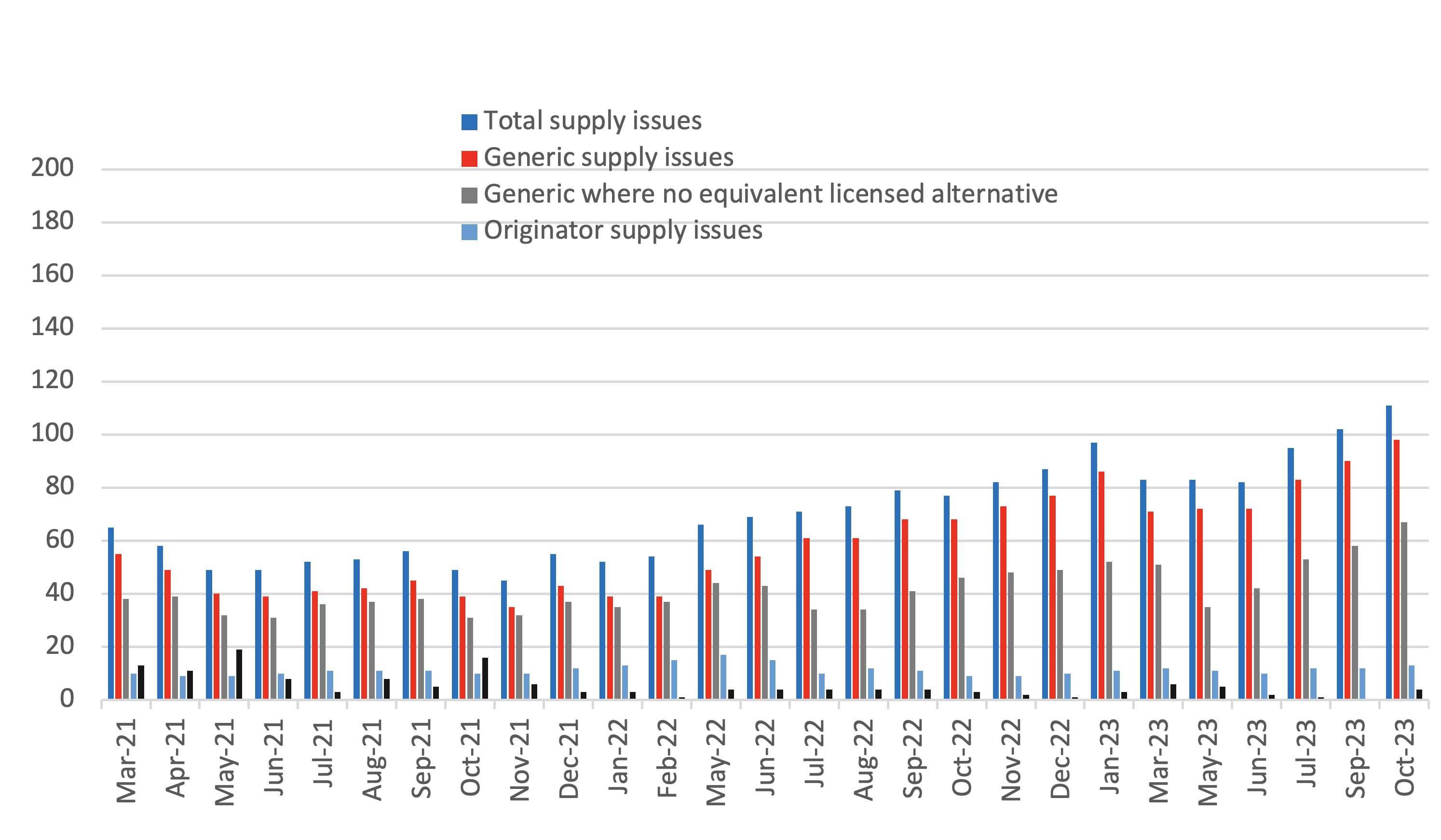 Looking at October 2023[1], Medicines UK provides a monthly snapshot of the numbers of supply issues affecting generic[2] medicines in England, based on UK Government and NHS data. Since our analysis in February 2022, the Department of Health and Social Care has moved its supply issues update to being hosted on the Specialist Pharmacy Service (SPS) website. As a result, we have changed some of the ways we measure different kinds of supply issues to replicate the categorisations in the SPS medicines supply tool.