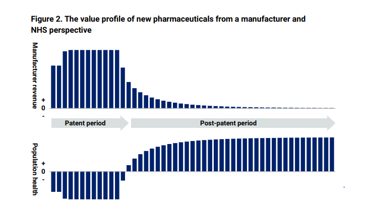 The report set out how a medicine's value is distributed between the manufacturer and NHS patients over its life cycle. During the on-patent period, revenue mainly accrues to the manufacturer due to the drug's monopoly protection. During this period, NHS patients experience a health deficit as the new medicine's benefits are outweighed by the impact on other NHS services. After the patent period, NHS patients start receiving significant net benefits from the availability of cheaper generic or biosimilar versions of the medicine.