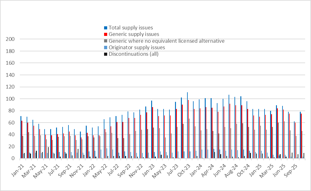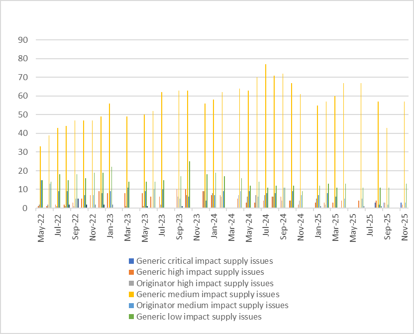 Looking at November 2025[1], Medicines UK provides a monthly snapshot of the numbers of supply issues affecting generic[2] medicines in England, based on UK Government and NHS data.